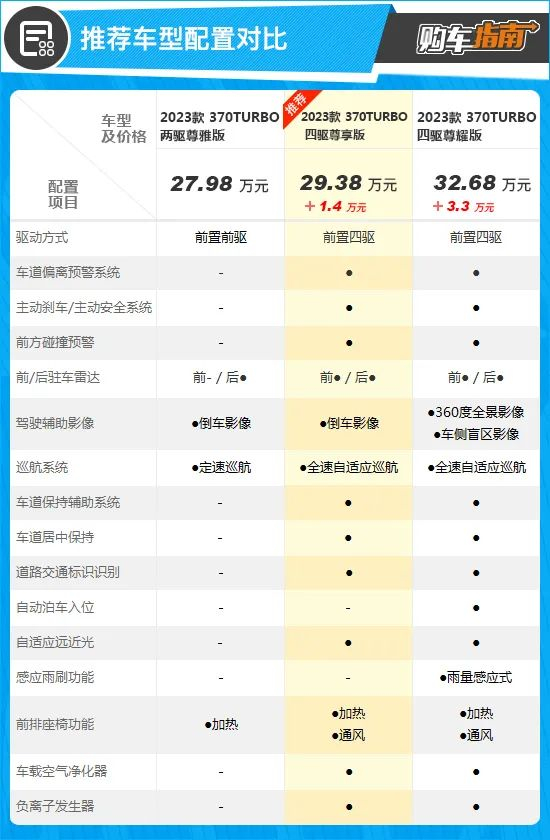 对于选购其它版本的朋友来说,小编更加推荐370TURBO 四驱尊享版,该车最大的优势在于搭载了动力更强的2.0T发动机,同时还配有四驱系统,驾乘体验更为出色。在配置上,推荐车型表现也非常全面,其中,舒适性方面配备了前排座椅加热、通风功能,并且还搭载了车载空气净化器和负离子发生器。在辅助驾驶方面,该车也搭载了全速自适应巡航功能,可进一步减轻驾驶疲劳感。结合其29.38万元的售价以及合资中型SUV的定位来看,整体性价比优势明显。