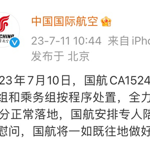 中国国际航空今天上午在其官方微博发布通报:2023年7月10日,国航CA1524航班(上海-北京),机型A330-300,在飞行过程中突遇晴空颠簸,机组和乘务组按程序处置,全力维护旅客安全,在此过程中一名旅客和一名乘务员受伤。航班于17时18分正常落地,国航安排专人陪同受伤旅客和乘务员前往医院治疗。我们对受伤旅客和员工表示关怀和慰问,国航将一如既往地做好安全运行和服务工作,感谢广大旅客的关心和支持。