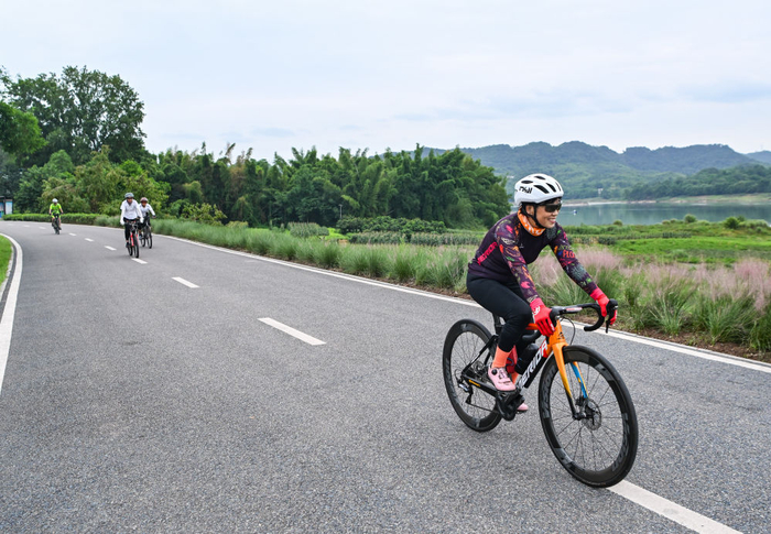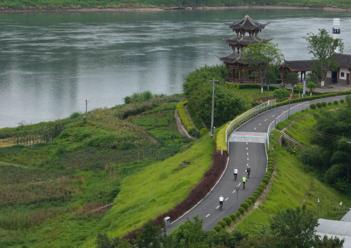 ↑骑行爱好者在宜宾市区至南溪区的长江环线绿道上骑行。