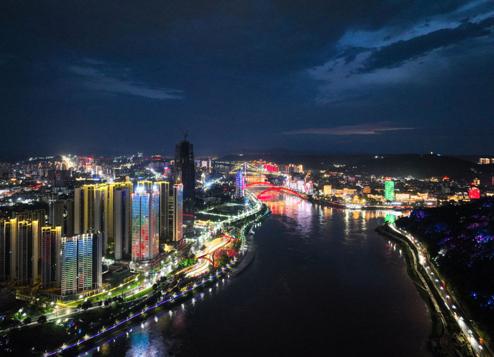 ↑一辆智轨电车行驶在宜宾市T1运营线上。
