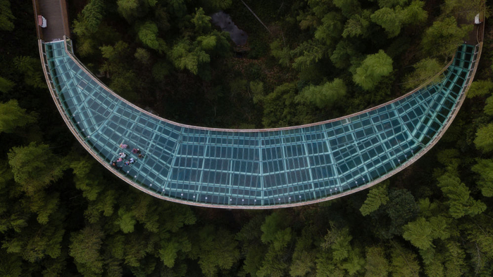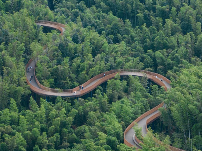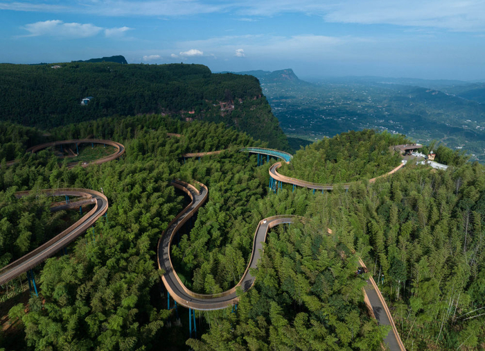 ↑游客在蜀南竹海的竹尖漫步步行走廊享受绿意。