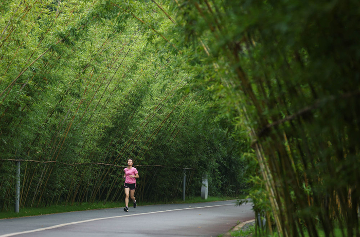 ↑一位运动爱好者在竹岛上跑步锻炼。长江竹岛已建成绿化面积2.6平方公里,拥有3.5公里活力环线,4.5公里亲水漫步带。