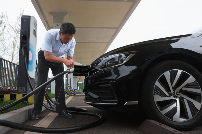 ↑一位电动车驾驶员在能源港光伏雨棚下为新能源汽车充电。