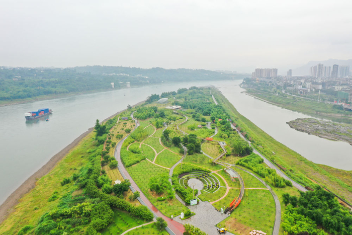 ↑长江竹岛俯瞰。竹岛建有竹博物馆、空中栈道、儿童乐园等多个配套设施。
