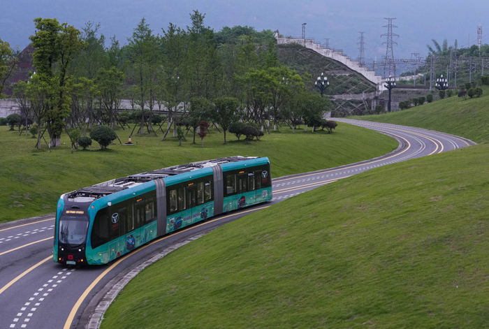 ↑这是宜宾市三江新区通往南溪区的智能轨道快运系统T4线,沿着长江边运行。