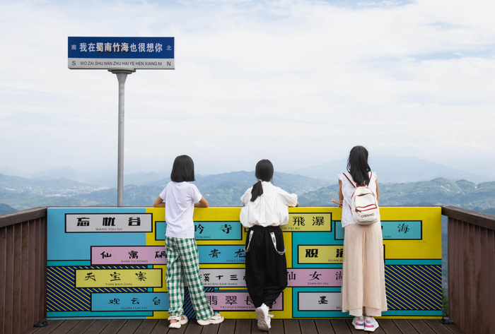 ↑游客在蜀南竹海竹尖漫步的一处观景台眺望远方。