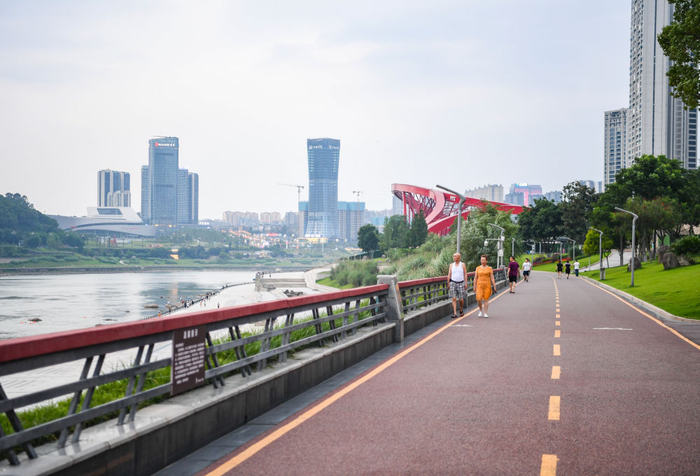 ↑在宜宾市三江口,市民徜徉在江边绿道上。