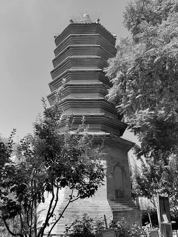 砖塔胡同东口有一座花木扶疏的小院,院门上端及两厢被茂盛的五叶地锦遮蔽,门牌“西四南大街43号”半隐半现。院门内竖立一块文保碑,上面镌刻着“全国重点文物保护单位——万松老人塔”字样,碑后便是青砖墓塔。