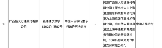 7月11日,北京商报记者注意到,原广西恒大万通支付有限公司(以下简称“恒大万通支付”)日前获批更名为中通支付有限公司(以下简称“中通支付”),公司主要出资人由上海湛迪信息科技有限公司变更为上海启匠信息技术有限公司(下称“启匠信息”),而启匠信息为上海中通数科商务服务有限公司(以下简称“中通数科”)旗下全资子公司,中通快递副总裁赖建昌为启匠信息实际控制人。