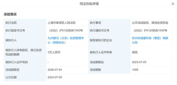 天眼查App显示,近日,九州建元(北京)投资管理中心(有限合伙)(简称“九州建元”)新增一则股权冻结信息,冻结股权标的企业为杭州米络星科技(集团)有限公司,股权数额为3万元人民币,上海市奉贤区人民法院为执行法院。