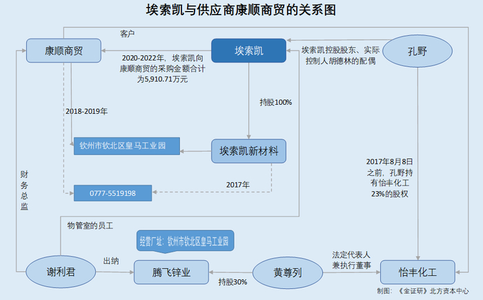 《金证研》北方资本中心研究发现,康顺商贸成立当年的联系电话,与埃索凯子公司2017年的联系电话一致。且康顺商贸的另一客户怡丰化工,或系埃索凯实控人妻子曾持股的企业。此外,埃索凯物管室员工谢利君与康顺商贸财务总监重名,且怡丰化工执行董事持股30%的腾飞锌业,其出纳亦为谢利君。并且康顺商贸与怡丰化工同位钦州市钦北区皇马工业园,埃索凯的子公司亦位于该工业园。