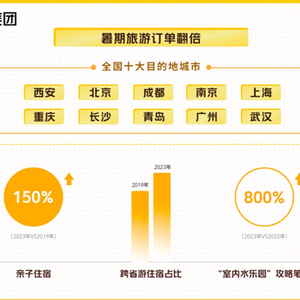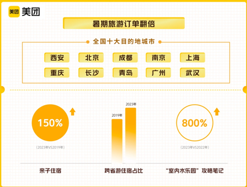 美团、大众点评数据显示,7月1日—10日,国内旅游消费订单(含酒店民宿、景点门票、交通等)相较2019年同期翻倍增长,西安、北京、成都、南京、上海、重庆、长沙、青岛、广州、武汉,成为全国暑期最为热门的十大目的地。其中,亲子相关的住宿预订量较2019年增长150%,跨省预订的住宿订单占比超过2019年同期。