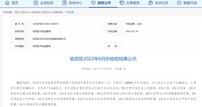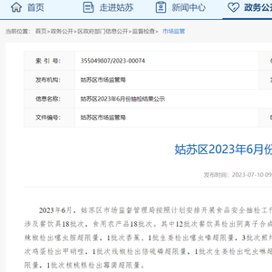 中国质量新闻网讯 据苏州市姑苏区人民政府网站2023年7月10日消息,2023年6月,姑苏区市场监督管理局按照计划安排开展食品安全抽检工作,共组织了1050批次食品抽检,总计检出不合格产品36批次。