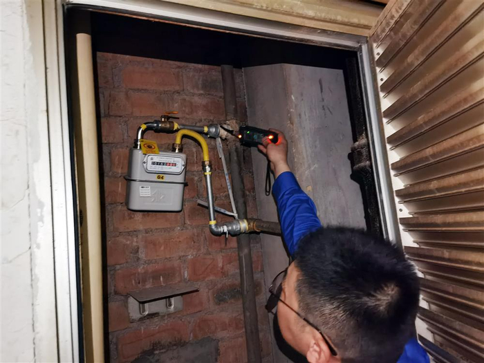 △身着蓝色制服的市北燃气工作人员正在楼内开展安全检查。手持仪器靠近主管道和入户管道连接处,仪器上的红灯随即闪烁不停,并发出蜂鸣声,说明漏得不轻。