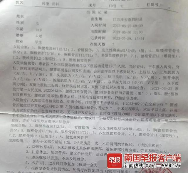 记者看到,小蝶的“出院诊断”显示,胸腰椎脱位T12/L1、脊髓损伤、完全性瘫痪ASIA分级A级以及多处胸椎骨折等。医生称,A级表示完全性损伤,患者脊髓无功能,胸部以下肢体瘫痪,无自主运动能力。