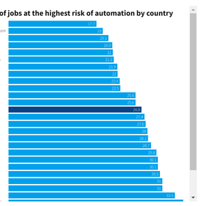 该组织在其《2023年就业展望》中表示,自动化风险最高的工作占经合组织国家劳动力的平均比例为27%,其中东欧国家面临的风险最大。