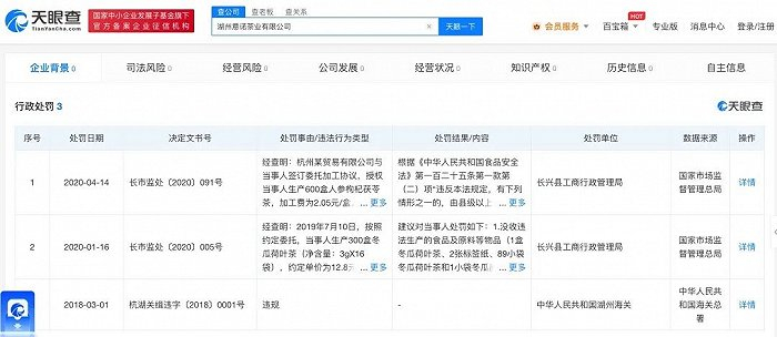 据天眼查信息,2020年1月和4月,湖州意诺曾分别因为“生产销售不符合食品安全标准的食品”以及“其它违反食品安全法规的行为”被长兴县工商行政管理局没收违法所得并处以罚款。