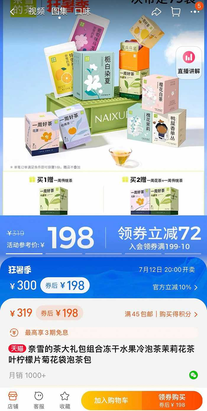 同为新锐茶饮品牌,奈雪的茶“霸气有料大礼包”净含量为407.5g,内里包含90g和40g超大单包茶品,券后价为198元,折合单价为0.49元/g,而CHALI花草茶包单价为0.76元/g。
