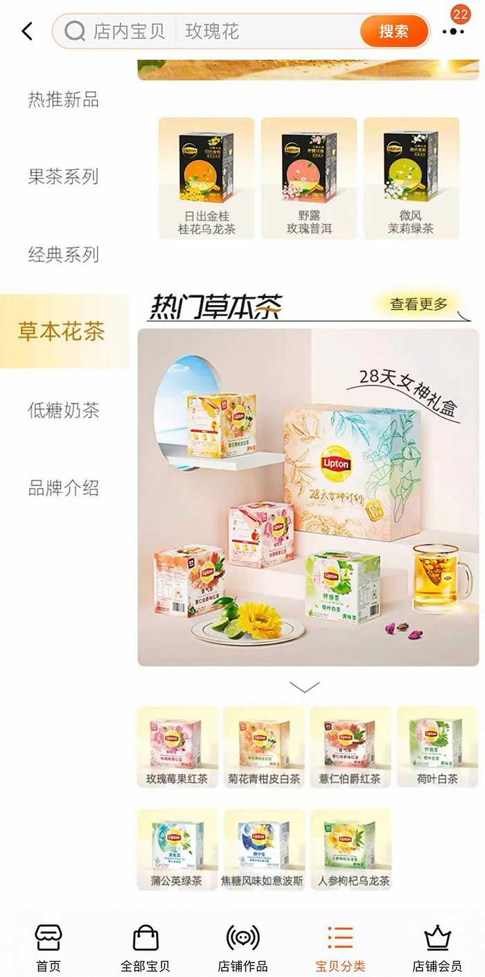 在天猫旗舰店,CHALI将旗下产品分为调理养颜茶、鲜爽水果茶、传统原味茶、超级新品(动干、冷泡茶)、多口味组合茶礼、拼配花草茶以及瓶装茶。