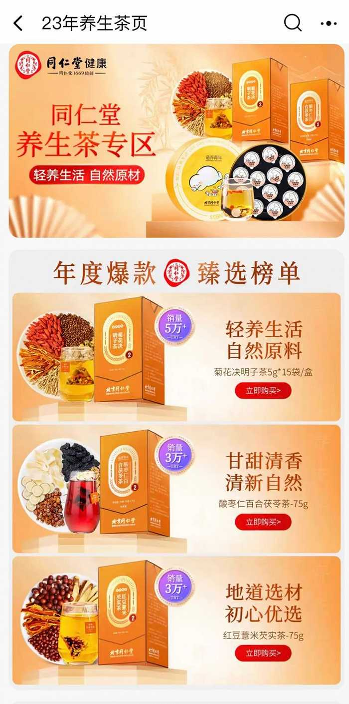 同仁堂等传统滋补品牌更注重养生品类,以红豆薏米芡实茶、人参桂圆红枣枸杞茶、人参五宝茶等作为镇店茶品。