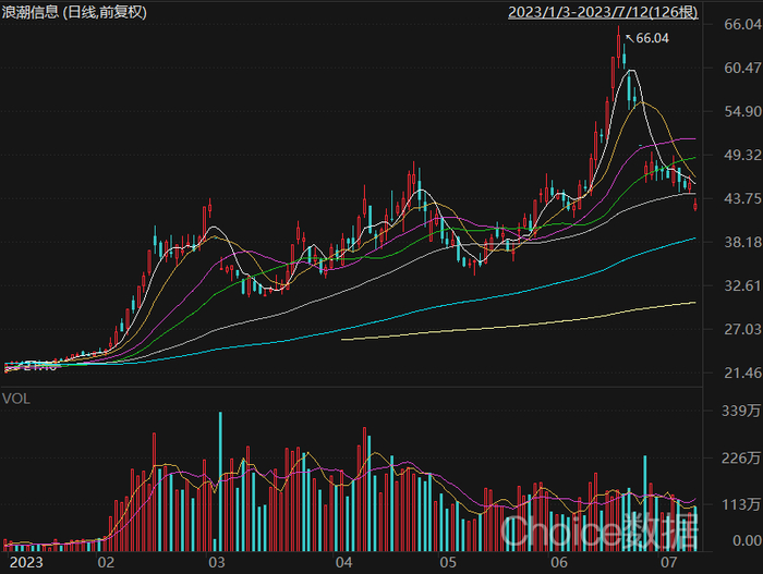 从二级市场来看,尽管因相关概念爆炒一度引发监管关注,但仍然难阻浪潮信息股价自2023年以来轻松翻倍(2022年12月30日收盘价21.46元/股)。2023年6月20日,浪潮信息股价曾一度触及66.07元/股历史高点(前复权),截至7月12日发稿时报42.86元/股,仍接近翻倍。