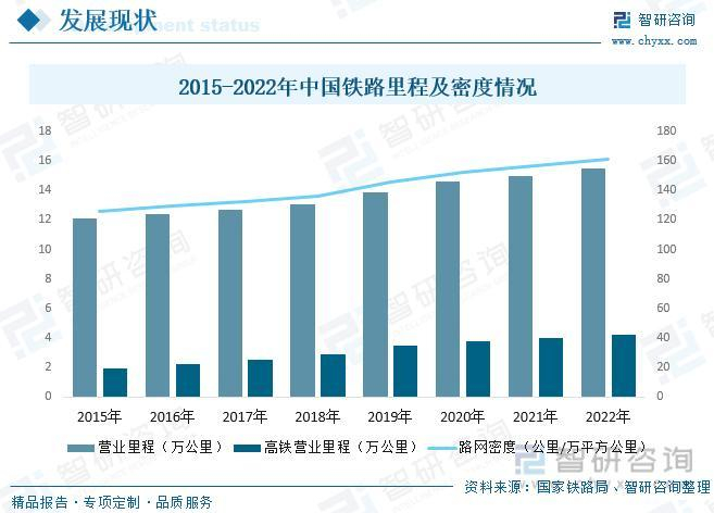 铁路是国家战略性、先导性、关键性重大基础设施,是国民经济大动脉、重大民生工程和综合交通运输体系骨干,在经济社会发展中的地位和作用至关重要,在服务和支撑中国式现代化建设中肩负着重要使命和重大责任。近年来,在国家政策的大力推动下,我铁路运营里程及路网密度水平持续增长。据资料显示,2022年我国铁路营业里程全国铁路营业里程达到15.5万公里,同比增长3.3%,其中高速铁路营业里程达到4.2万公里,同比增长5%。全国铁路路网密度为161.1公里/万平方公里,同比增长2.8%。