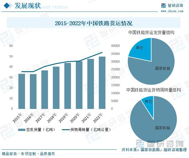 内容概况:由于铁路具有大运量、低成本、占地少、绿色环保等特点,大力发展铁路运输符合我国国情和产业导向,铁路行业中长期还将是国家调整运输结构、降低社会物流成本、打赢蓝天保卫战的先导产业,使得我国铁路运输行业迅速发展。据资料显示,2022年我国铁路总发货量为49.84亿吨,同比增长4.4%,其中国家铁路占比为78.3%;铁路货运周转量为35945.69亿吨公里,同比增长8.1%,其中国家铁路占比为90.9%。