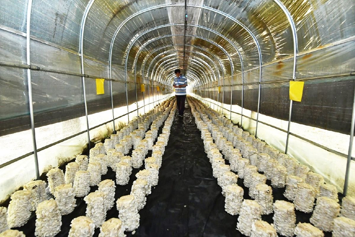 今年,北京市农林科学院植物保护研究所研究员、北京市食用菌创新团队首席专家刘宇探索性地在军屯村开展高效循环种植模式试验,用林下修剪的树枝、枯叶等林间废料粉碎后加水混合,经过堆积发酵,按照穴播的方式,一层料一层种,帮助蘑菇自然发菌生长。“蘑菇全部收完后,留下的原料又可以再次返回到林下,成为助力树木更好更快更健康生长的天然养料,形成了高效循环模式。”