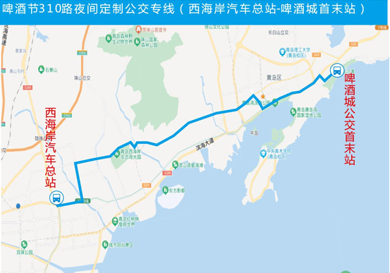 增设漓江西路青云山路、金沙滩壹号小区、青岛国际啤酒城西、啤酒城公交首末站,共4处站点,其他站点同公交310路站点。