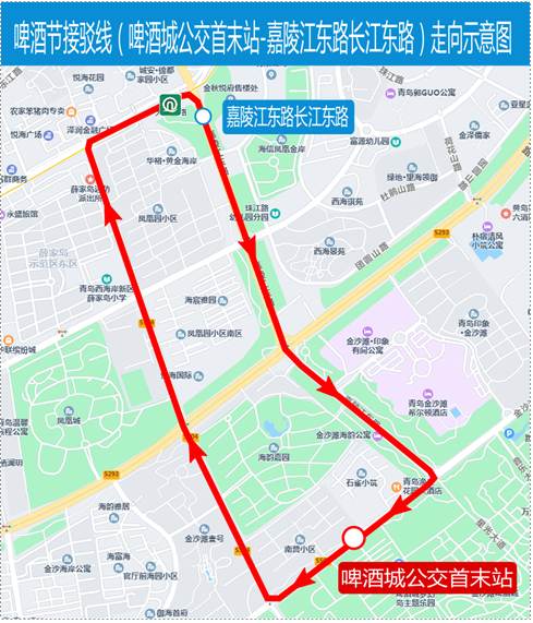 增设漓江西路青云山路、金沙滩壹号小区、青岛国际啤酒城西、啤酒城公交首末站,共4处站点,其他站点同K21路站点。