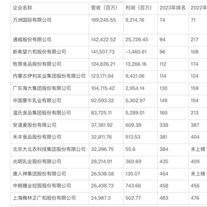 2023年《财富》中国上市公司500强排行榜,新希望六和成农业领域中唯一亏损企业