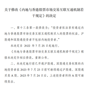 根据证监会官网,修改后的《内地与香港股票市场交易互联互通机制若干规定》已于2022年7月25日起施行,香港经纪商不得再为内地投资者新开通沪深股通交易权限,内地投资者也不得通过沪深股通买入A股,一年过渡期即将结束,这意味着上述规定生效在即。