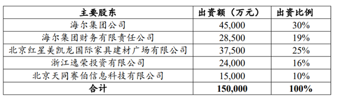 公开信息显示,海尔消金由海尔集团、海尔集团财务公司、红星美凯龙、浙江逸荣投资、北京天同赛伯信息科技共同发起设立,于2014年12月正式成立。