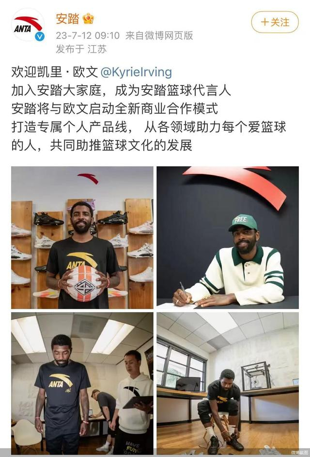 7月12日,安踏官方微博发布了这样一则信息“欢迎凯里·欧文 加入安踏大家庭,成为安踏篮球代言人”,欧文在微博也与安踏进行了互动。安踏微信公众号也发布了这一消息。