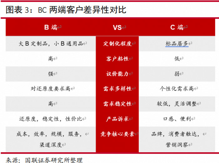 B端客户需要定制化产品和通用型产品,而C端以标品居多,且强调个性化。