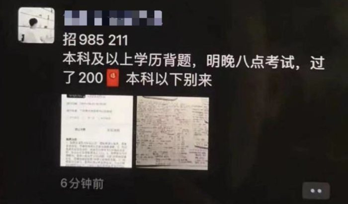 有“黄牛”招募985、211本科及以上的大学生背题,参加JJ20的“考试”:“明晚8点考试,过了发200元红包,本科以下别来。”