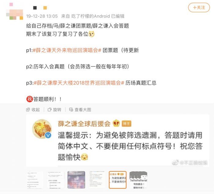 比如薛之谦演唱会,薛之谦后援会的歌迷需要参加会员团票答题才有资格购买。有歌迷总结了历年“入会真题”,甚至有歌迷更新“错题本”,一到演唱会便会晒出:期末了,各位该复习复习了。