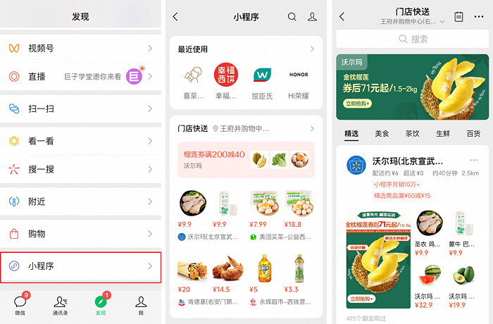 7月7日开始,第二批12个城市陆续上线门店快送。消费者点击微信发现页小程序,可看到“附近的小程序”变成了“门店快送”,而“我的订单”被移入下一级的门店快送页面。