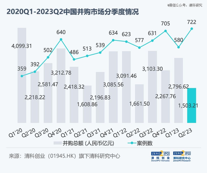 季度数据方面,第二季度并购市场中交易数量有所回升,但交易规模仍较为低迷,季度内完成并购交易722起,同比增长25.1%,环比增长24.5%;市场交易规模1,503.21亿元,同比下降9.5%,环比下降46.2%。