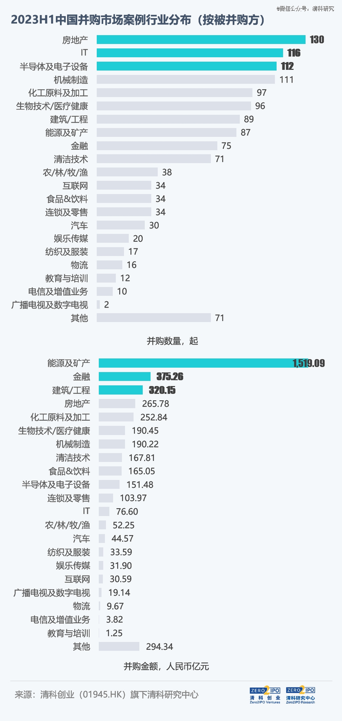 2023年上半年中国并购市场中房地产整合进程加速,针对房地产企业和项目的并购案例数量较多,与科技创新相关的IT、半导体及电子设备、机械制造、化工原料及加工、生物技术/医疗健康等行业内并购活动依旧活跃。