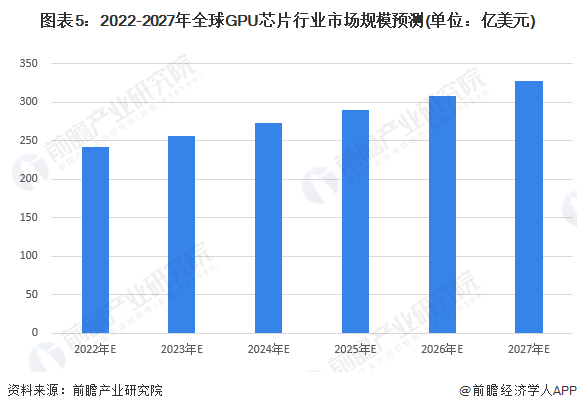 预计2027年全球市场规模超过320亿美元。根据JPR资料,预计2022-2026年,全球GUP出货量将实现6.3%复合年增长,以此增长率测算2027年全球GPU芯片行业市场规模将超过320亿美元。