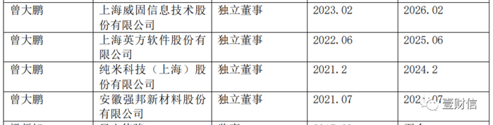 但据英方软件2022年披露的年报显示,除了强邦新材招股书披露的兼职外,曾大鹏还兼任伟时电子和上海威固信息技术股份有限公司(以下简称:上海威固)的独立董事,起任时间分别为2022年5月和2023年2月。