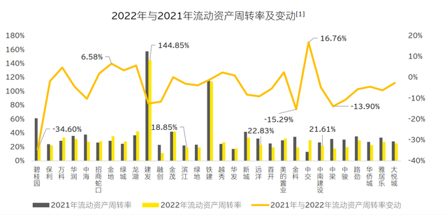 2022年前30家上市房企中有20家企业的流动资产周转率水平较去年有所下降,其中碧桂园降幅最大,约为34.60%;金科和中梁的流动资产周转率也下降较大,分别同比下降15.29%和13.90%。流动资产周转率的大幅下降,主要系受营业收入的大幅下降所致。另外,有10家企业的流动资产周转率水平较去年有所上升,其中中交与金地的流动资产周转率分别较去年上涨16.76%和6.58%,主要系公司积极应对市场变化,优化现金流平衡安排,实现了对项目利润、现金流、成本等的全过程管控。建发及铁建流动资产周转率较高主要系公司实施多样化经营,即使房地产销售业务下降,非地产业务收入增长依然强劲所致。