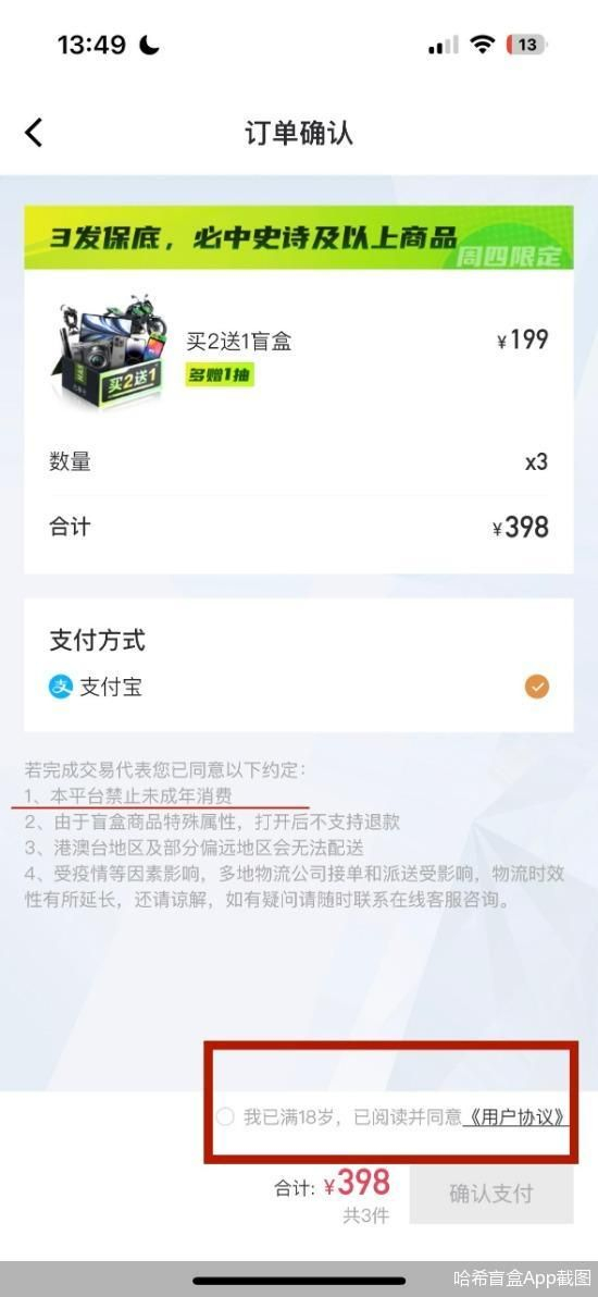 北京商报记者在52TOYS微信小程序中看到,在抽盒机抽完盲盒后的支付页面有标注称,“未成年人消费者的一切消费行为必须经过监护人同意并在其陪同下进行”,但同时也标注了“盲盒类商品付款后即完成在线拆盒,不使用七日无理由退货,非质量问题不退不换”;在rolife若来天猫旗舰店中,一款盲盒产品的详情页面以及支付页面均没有针对未成年人的提醒和监管,但有明确提醒,“特别商品不支持7天无理由退换货”;而在一款名为“哈希盲盒”的App中,支付界面有提示称“本平台禁止未成年消费”,且需要勾选“我已满18岁,已阅读并同意《用户协议》”,但并不需要进行实名认证。