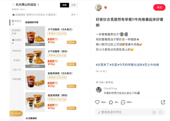 在小红书平台上,不断有网友晒出古茗新上线的“超值咖啡早餐”套餐,4款套餐分别为“元气饱腹餐”及“能量满满餐”,定价13元-20元,主食有芝香火腿可颂与芝香火腿牛肉卷两种可供选择,通过咖啡和食品的不同组合满足消费者的不同偏好和需求,得到消费者的肯定。目前这一新业务仅在杭州试水,如果成绩出色的话,未来大概率会很快推广至全国。