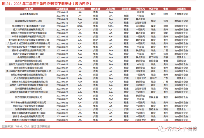 境内评级下调方面,随着境内评级密集调整期的到来,季末评级负面调整事件较多。二季度共统计到29家发行人境内评级或展望被下调,其中包含21家城投,以贵州省居多,除城投外综合、煤炭等行业也各有1~2家发行人被下调。