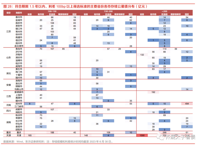 公募债方面,强区域下沉空间有限,中等资质省份还尚有空间。截至2023年6月30日,符合以上筛选条件的城投债余额合计12362亿元。天津、江苏和山东为合意债存续规模前三的省份,余额均超过1000亿元,河南以960亿元的规模位列第四,湖南、重庆、江西等10省也统计到有300亿元以上符合条件的存量债,而强区域如广东、福建、北京等地余额则不足百亿元。从行政层级分布来看以地市级和区县级为主,个别省份有所分化,整体来看强区域满足筛选条件的主体以地市级及以下级别为主,而弱区域则层级有一定上浮,如云南、贵州、山东等地较多省级和国家级新区平台都有一定利差。
