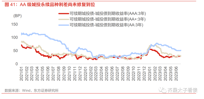 在利差赎回潮冲击后的一季度修复期,AAA级永续品种利差率先于季度末修复到位,AA+级收窄速度稍慢但二季度延续修复趋势,并于最终于二季度末压缩至与AAA级同等水平,当前仅剩AA级品种利差仍在高位,参考去年年中资产荒行情下各等级品种利差均压缩至30bp以内的水平,AA级永续债有利差压缩空间,但后续走势仍需观察市场供需情况。