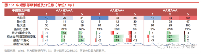 等级利差方面,二季度AA+级中长久期利差走阔幅度较大,致使AA+减AAA等级利差走阔而AA减AA+级收窄。1年期各等级利差以小幅波动±2bp以内为主,3年期和5年期AA+减AAA等级利差分别走阔13bp、7bp,而AA减AA+级则是收窄7bp左右,结合信用利差走势可知主要原因为AA+级中长久期利差走阔幅度较大。当前1年期各等级利差分位数均已降至10%左右,短久期下沉策略空间相对有限。