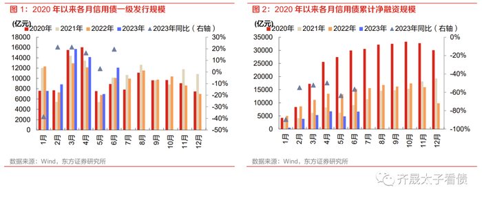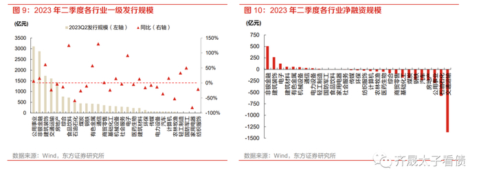 二季度一级发行热度回暖,但受偿还量大增影响净融资明显缩量。2023年二季度各月非金融企业信用债分别发行14136亿元、6980亿元和12090亿元,季度发行总规模环比增加3%、同比增加14%,但受到期规模同比大幅扩张28%影响,最终合计净融入仅1340亿元,同比、环比分别大幅缩减68%和75%,信用债一级净融资供给仍处紧平衡。从分月发行节奏上看,二季度各月发行量均同比增长,特别是6月新发规模还创2020年以来同期新高,但受制于每月到期规模同比均有近30%的增幅,4月和6月在发行规模同比分别增长16%和20%的情况下净融资与往年同期比较依旧趋弱,发行淡月5月净融出额更是高达1914亿元。